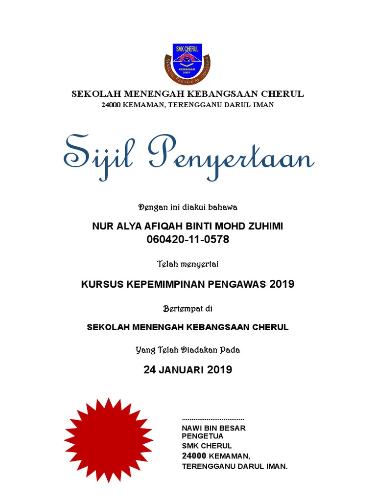 Sijil Pencapaian 100 7 Hari Berkursus Bagi Tahun 2019